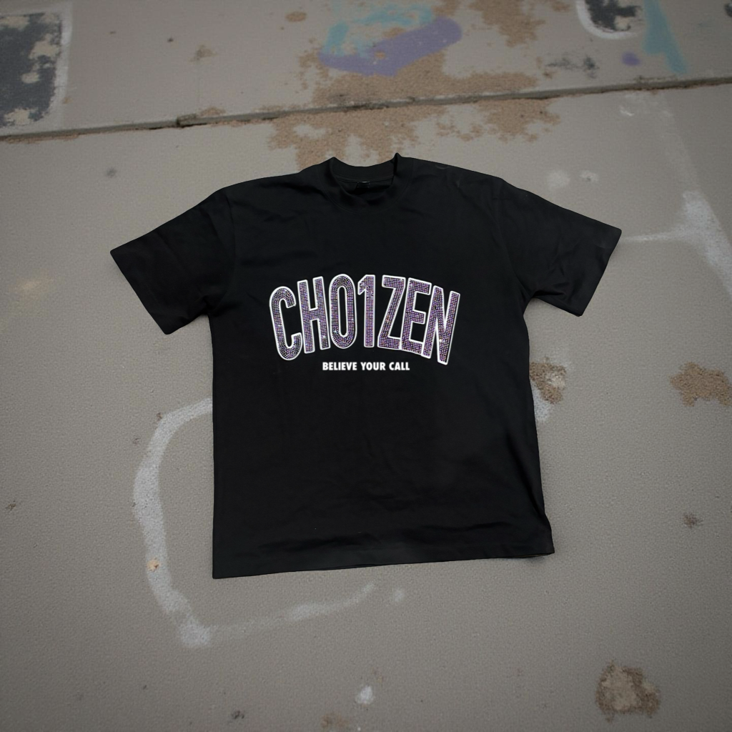 Step bold in the black CH01ZEN tee — where purpose meets pressure. Rhinestone-lit and built to remind the world: you were chosen to shine.